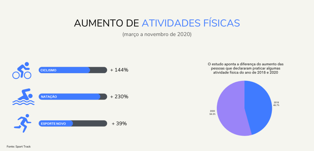 Dados do Strava, aplicativo on-line voltado para amantes do esporte, registraram um crescente aumento de adeptos das atividades físicas no ano de 2020. Durante os primeiros meses da pandemia, foram dois milhões de novas adesões ao aplicativo, totalizando mais de 73 milhões de atletas pelo mundo – mais de 9,5 milhões só no Brasil.